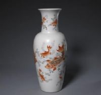瓶撇口,短直颈,溜肩,腹部上丰下敛,圈足。内施白釉。外壁矾红彩加绿彩绘通景鱼藻纹,生动传神。圈足内施白釉。无款识。