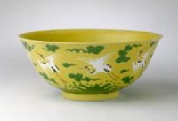 黄釉器在清代是皇帝的专用器具。仙鹤寓意长寿,为清代瓷器上所习见的吉祥图案。