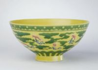 碗撇口,腹部下敛,圈足外撇。里外皆施黄釉。外壁用绿彩绘带状祥云,间饰红色蝙蝠口衔绶带葫芦,寓意“福寿万代”,近底处绘绿色莲瓣纹一周。外底书青花“大清雍正年制”六字楷书款。