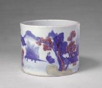 笔筒胎体厚重,釉面洁白,绘画笔触飘逸潇洒,给人以朦胧的美感。