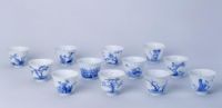 杯12件一套,撇口,深弧壁,圈足。内外施白釉,外壁青花装饰。其上分别绘有代表12个月的花卉,并且配有与之相对应的诗句。分别是:一月,水仙花,“春风弄玉来清书 ,夜月凌波上大堤。”二月,玉兰花,“金英翠萼带春寒,黄色花中有几般。”三月,桃花,“风花新社燕,时节旧春浓。”四月,牡丹花,“晓艳远分金掌露,暮香深惹玉堂风。”五月,石榴花,“露色珠簾映,香风粉壁遮。”六月,荷花,“根是泥中玉,心承露下珠。”七月,兰花,“广殿轻香发,高台远吹吟。”八月,桂花,“枝生无限月,花满自然秋。”九月,菊花,“千载白衣酒,一生青女香。”十月,芙蓉花,“清香和宿雨,佳色出晴烟。”十一月,月季花,“不随千种尽,独放一年红。”十二月,梅花,“素艳雪凝树,清香风满枝。”诗句的结尾用书写的形式钤青花篆体“赏”字。
