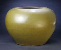 鳝鱼黄釉属于铁、镁结晶釉,清代宫廷档案称之为“厂官釉”。由于烧成工艺的某些差异,厂官釉的色调有多种变化。清雍正时期厂官釉品种名目繁多,如蟹甲青、鳝鱼黄、瓜皮绿等。此钵釉色偏黄,色如鳝鱼皮色,匀净优雅,且器型规整,为典型的雍正朝制品。