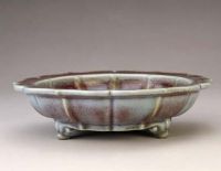 盆托折沿,通体六瓣菱花式,下承以三个云头形足。里外满施仿钧釉,底刻阳文篆书“大清雍正年制”三行六字款。