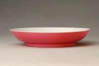 盘敞口,弧壁,圈足。盘内及足内均施白釉,外壁施胭脂红釉。外底署青花楷书“大清雍正年制”双行六字款,外围青花双圈。