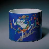 笔筒呈圆筒形,圆口,直壁,玉璧形底。内施白釉。外壁洒蓝地五彩装饰。主题图案绘魁星右手执神笔,左手于胸前握一银锭,立在梅花树桩之上,作向前奔跑状。外底心施白釉。无款识。