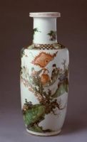 瓶盘口,直颈,斜肩,直腹,圈足。这种造型的瓶因形似古代洗衣用的棒槌,故被称作“棒槌瓶”。内外施白釉,外壁五彩装饰。口边饰红彩,颈部绘竹石花卉两组,肩部分布斜方锦地四组开光,开光内分别绘山村草舍。腹壁主题图案表现的是《隋唐演义》中的战争场面——秦叔宝策马迎战尉迟恭,唐王李世民和徐茂公临城观战,空间衬以矮山花树。这种图案俗称“刀马人”,清代康熙时期经常用在陶瓷的装饰画面中。圈足内施白釉。无款识。