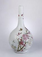 瓶直口,长颈,圆腹,圈足外撇。通体白釉,粉彩装饰。外壁绘桃树一株,蔓遍器身,花蕾欲放,鲜花婀娜,绿叶青翠,彩蝶飞舞其间。胭脂红彩描绘的花朵颜色深浅不同,花心部分色料最厚,从花心到花瓣边沿红色渐趋浅淡。圈足内施白釉。外底署青花楷书“大清雍正年制” 双行六字款,外围青花双线圈。