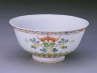 碗口外撇,弧腹,圈足。碗内光素,碗外施粉彩图案三组:口沿绘缠枝花一周;碗身饰折枝葫芦上托红色蝙蝠;近底处为变形莲瓣纹。“蝙蝠”和“葫芦”寓意“福禄”。外底青花双方栏内书“大清雍正年制”双行六字楷书款。