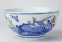 碗外壁以青花加彩装饰,绘两雉鸡、双飞燕,衬以山石、牡丹、玉兰。一对雉鸡立于山石上昂首远眺,尾部一垂一翘。双燕上下翻飞,极具动感。山石用青花描绘,使用分水法表现阴阳向背。牡丹花用色较多,有红、黄、绿、淡紫等色,缤纷艳丽。此装饰题材寓意“玉堂富贵”、“喜报春来”。