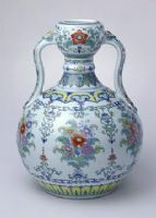 此瓶以釉下青花双勾图案轮廓,釉上填绘胭脂红、锑黄、水绿、蓝、紫等各色粉彩料。以粉彩代替传统五彩而形成的斗彩是雍正时期的创举。