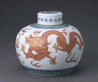 罐小口,矮直颈,丰肩,扁圆腹,卧足,带盖。腹部两面以矾红彩分别描绘龙、凤戏珠纹。斗彩只用作装饰颈、肩、胫、盖等次要部位的辅助纹样。底青花双圈内书“大清康熙年制”双行六字楷书款。