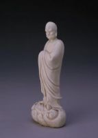 此像人物塑造生动,五官紧凑,眼聚沉思,神色安然从容,体现出达摩直契佛心自明永恒的坚定与淡然。汹涌翻卷的海浪,随风飘拂的衣衫都塑造得很有动感。瓷像施釉如凝脂,似美玉,滋润柔滑。其工艺成就代表了明代德化窑的制瓷水平。此达摩像的制作手法与故宫博物院收藏的明代德化窑“何朝宗”款达摩像十分相似,只是尺寸较小。
