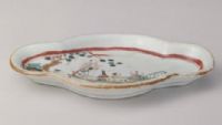 此盘造型别致,釉面洁白,器足圆润,画面主要以红彩为主,绿彩点缀其间,整体色彩淡雅,笔意粗率奔放,虽寥寥数笔,人物姿态却极为生动。据考证,此种海棠式盘系当时为适应日本市场需求而专门烧造的外销瓷,具有鲜明的时代特征。