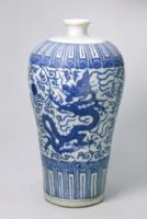 明万历时青花瓷器器型丰富多样,且制做大型器物之风十分盛行。当时的青花梅瓶最高者可达六十多厘米。其形制多为撇口或小直口,长颈,硬折肩,腹细长渐收。纹饰亦十分多样,有云龙、缠枝花卉、人物纹等多种。此瓶器型高大规整,釉面润泽,青花色泽蓝中泛紫,是万历青花大器的代表作