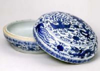 盒扁圆形,盒盖平顶微隆,子母口,圈足。盖面绘青花龙凤穿枝花纹。盖、盒外壁亦绘龙凤穿枝花纹,盖、盒口沿绘卷草纹,上下呼应,各组纹饰间以双弦纹相隔。足内青花双圈内署“大明隆庆年造”六字款,隆庆时期款识书“造”而不书“制”,成为一明显的时代特征。