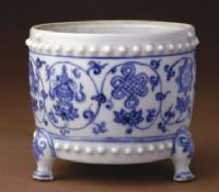 炉呈鼓式,直腹,下承三蹄形足。口及足边分别饰一周鼓钉纹,腹部为青花缠枝莲托八宝纹。炉底中央双圈内青花楷书“大明成化年制”六字款。