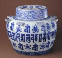 图片名称: 青花蓝查体梵文出戟法轮盖罐