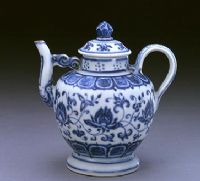 壶直口,腹部滚圆,圈足外撇。一侧置弯流,为加固壶流,流、颈之间连以云形横板,另一侧置曲柄。通体青花装饰,颈部绘缠枝莲纹,柄上绘忍冬纹,流的根部绘龙头,龙张口怒目作衔流状。流的正面署青花楷书“大明宣德年制”六字一行款,外围青花双线长方框。壶附伞形盖,盖顶置宝珠钮,盖面绘折枝花纹。
