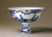 明宣德青花使用进口青料,此种高铁低锰料在烧成过程中青料易晕散,故所绘纹饰不够清晰。此碗青色较为淡雅,纹饰比较清晰,实为难得。其云气纹用粗、细线勾画轮廓,此画法对后世瓷器纹饰亦有影响。明宣德时陶瓷器物中以人物纹为题材者较为少见,故此碗为宣德时期人物纹器物的代表作品。