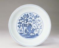 宣德青花瓷器造型敦厚端庄,釉面青亮,纹饰细腻豪放,笔法潇洒,一向被列为明代青花之冠。此盘主题纹饰为松竹梅纹。松竹梅世称“岁寒三友” ,寓意高风亮节。外壁绘画的庭园仕女图为研究明代贵族妇女的生活提供了宝贵的资料。由于宣德时期青花原料数量较少,因此在青花器上绘制人物图案者为数不多,此器则更显珍贵。