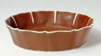 洗通体作十瓣菱花式,敞口,浅身,腹壁近直,平底。通体施鲜红釉,釉面匀净,色鲜艳。口沿与腹壁花瓣出筋处显露洁白的胎色,与器身的红釉相映生辉。底施白釉,无款。