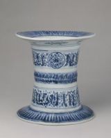 尊身为直筒状,上下口处均为宽折沿。通体青花纹饰,口及底沿饰菊瓣纹,器身纹饰分三层,上、下两层仿写阿拉伯文并绘团形图案,中间一层饰仰覆变形花瓣纹。