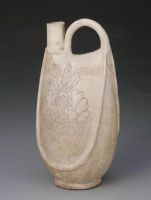 此壶扁圆形,短流,肩上有一提梁,圈足。通体施白釉,壶身两面刻花叶纹。此器朴素粗犷的风格反映了游牧民族豪放的气质。
