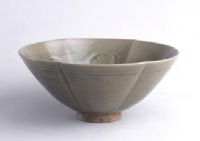 碗敞口,腹为六花瓣形,近底渐收,圈足。内壁蓖划海水纹,碗心刻划一游鸭,外壁光素无纹。通体以青釉为饰,釉色深沉,青中泛黄。
