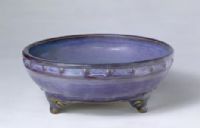 洗作鼓式,亦称鼓式洗。器身上下饰鼓钉二周(上22枚,下18枚),其下承以三如意头足。洗内施天蓝色釉,外为玫瑰紫色釉。底刷黄褐色薄釉,绕底一周有支烧痕,并刻有“一”字标记。河南禹县钧台窑址曾发现刻有“一”至“十”数目字的钧瓷标本,与故宫博物院收藏的官钧窑瓷器相同,此类数目是同类制品从大到小的编号。