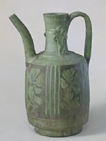 器直口,长颈,椭圆形腹,壶体一侧为长圆形弯曲的流,另一侧为圆柱形柄,圈足。颈部两侧对称贴塑花纹。通体施绿釉,釉层较薄,露胎处呈黑褐色。腹部以剔刻的四条竖道为一组间隔出六个开光,开光内剔刻折枝花卉。