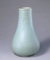 瓶圆口,直颈,垂腹,圈足。通体内外施青釉,釉面开有冰裂状纹片,上部开大片纹,近底处纹片细碎