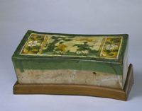 枕呈长方形,两端稍阔,中间略收,一侧面有一圆形通气孔,施釉不到底。枕面以刻划法勾勒边框,纹饰分3组,中间一组为人物纹,二人前后相伴而行,服饰一黄一绿,前者手持鱼篓,后者扛杆,似去垂钓。周围的绿树、青草、黄云透出生机。两侧2组黄地开光内各绘折枝花一朵,白花绿叶,开光外衬以褐黄色地。枕面的边框外至枕侧面施绿彩。