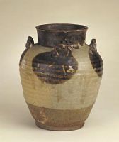 罐直口微撇,丰肩,肩以下渐敛,平底。肩部置四系。通体内外施青灰色釉,外壁施釉不及底,口部及四系处涂以酱色釉斑。此罐为四川邛窑产品。