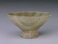 此杯的口沿和杯身造型屈曲有致,犹如海棠花开,杯足较高,外撇。此种造型来源于萨珊金银器“多曲长杯”,具有浓郁的西域风格。此样式进入中国后,南北方瓷窑都有烧造,成为唐代较为流行的式样。