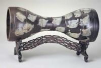 腰鼓广口,纤腰,鼓身凸起弦纹七道。通体以花釉为饰,在漆黑匀净的釉面上,泼洒出块块蓝白色斑点,宛如黑色闪缎上的彩饰,优美典雅。