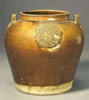 罐唇口,直颈,丰肩,圆腹,腹下敛,平底。胎呈灰白色,器身施褐中泛黄色釉。肩部有对称方形双耳及四朵模印贴花纹。近足处一周及底部素胎无釉。