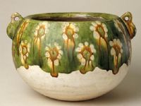 罐呈扁圆形,口内敛,平底,口外两侧各有一系。器内施黄釉,外壁以绿釉为地,上以白、黄、绿三色点染花朵。器施半釉不到底,露胎处呈白色。