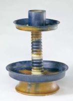 烛台分上下两部分,上盘小,下盘大,中间承以起弦圆柱,圈足外撇,上盘中心立杯形烛座;通体施蓝、黄、绿、白彩釉,底素胎无釉。