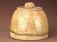 权平底,底心有一圆孔,中空,顶部饰一兔钮。器身薄施一层青釉,釉色泛黄,施釉不到底。外壁模印莲瓣纹一周,上为6组团花,间以条纹。