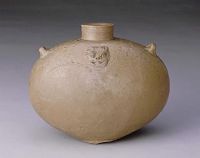壶小直口,肩上有两小系,器身呈扁椭圆形,平底微内凹。通体施青釉,双系之间印圆圈带状装饰,中间贴塑一兽头,这是西晋时期普遍采用的一种装饰方法。扁圆的形体和设计巧妙的双系使之既实用又便于携带。