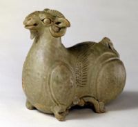 羊卧伏状,昂首张口,体态肥硕可爱。背部饰对称的线条纹。腹部浅刻戳点和条纹,似羽翼张扬。此器釉色青绿,晶莹润泽。羊首上端开一圆洞。