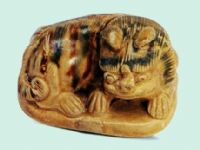 镇纸是一种文房用具。清人陈浏《匋雅》卷上:”镇纸谓之压尺,铜与瓷玉皆有之,亦多肖生物者。”同时也可作陈设瓷。此件瓷质镇纸,作卧狮形,狮头微抬,瞪目竖耳,四腿卷曲,刻划了狮子在小憩的神态。周身用黄、褐、绿彩作装饰。釉色清淡雅致,光润柔和,是长沙窑釉下彩绘陶瓷的典型作品。长沙窑多见狮、象、牛、羊、猪、狗、马等瓷塑。