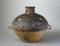 罐小口,圆腹,腹侧安双环耳,平底。胎呈暗红色。肩及上腹部以宽肥的黑彩条带和细窄的锯齿状条带构成漩涡纹,利用弧线的起伏旋转表现河水奔腾向前的韵律感。这种将柔和的弧线和醒目的圆点相结合构成二方连续的装饰带,是马家窑文化的典型构图方式。