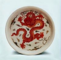 口沿外折,直腹,平底。内底绘朱龙一条,间饰黄绿彩云纹,画面精美,寓意吉祥,色彩绚丽。康熙五彩是在明代五彩五彩的基础上继承其传统技法而又有创新和发展,达到了中国传统彩瓷的顶峰。此碟制作精致,为康熙五彩之佳作。