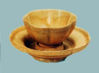 盏呈花瓣形敞口,弧壁,圈足。托形圆似盘,花边卷口,盘中心有作为承托的凸起的圆圈(即托口)以承盏。通体青白釉泛黄,并有细碎开片。唐宋时期饮茶之风大盛,南北瓷窑竞相生产各类茶具。此件托盏为宋代繁昌窑产品。