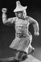 巴蜀地区的说唱俑,是汉代陶塑艺术中尤具神韵,造诣极高的作品。三峡博物馆珍藏的这件说唱俑即是其代表性作品之一。这位二千年前的民间艺人,袒裸上身,高耸双肩,左手抱鼓于腰,右手(握槌已掉)指着嘴角,眉飞色舞说唱正到精彩处。那俏皮、戏谑而极尽夸张之情态,将其娱悦谐趣,发挥至极。说唱俑形象即汉代的民间艺人“俳优”,多为矮胖身材的侏儒作谐戏表演,“俳优侏儒之笑不乏于前”。汉代的俳优表演有说有唱,有乐(鼓)有曲辞,已具古代戏曲艺术的诸多重要因素,其传承演变,对古代话本小说的兴起也有一定的促进作用。