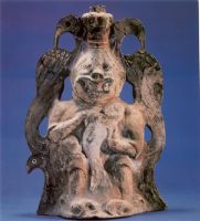 壶头为蒜头状,壶体正面高浮雕一呈坐姿的怪兽。怪兽面部肥胖,两眼凸起,鼻|子高大,嘴大张露出四齿,脖子短粗。身呈人体状,着衣捋袖,裤腿亦捋至膝盖。手|脚均为鹰爪。双手抱一鱼。壶两侧上下各塑二鸟,鸟首相背,长尾下垂与下部鸟首相接。通体用红、白、浅蓝彩绘。壶身背面平坦,原有彩绘现已脱落。双鸟怪兽彩绘陶壶,造型别致,浮雕画面形象生动,带有浓厚的宗教迷信色彩,这种形象可能与远古神话传说有关。