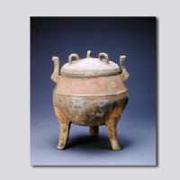 首都博物馆藏。泥质灰陶。微敛口,鼓腹,圜底,三兽形蹄足,口沿上双附耳,耳上刻划S形纹,半球形盖,盖面贴塑三卧兽为钮,腹部浅刻涡纹。陶鼎表面有朱绘痕迹。