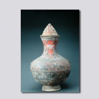 首都博物馆藏。泥质灰陶。盘口,长颈,扁圆腹,台阶式圈足,博山式盖,肩部有对称铺首。颈部及腹部以红、白、蓝、黑彩绘,腹部有三道弦纹将图案分成三组。