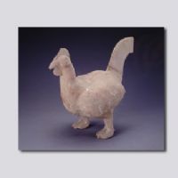 首都博物馆藏。泥质红陶。明器。鸡首高昂,鸡冠冲天,身体肥硕,尾巴翘起,两侧翅膀划有羽毛。